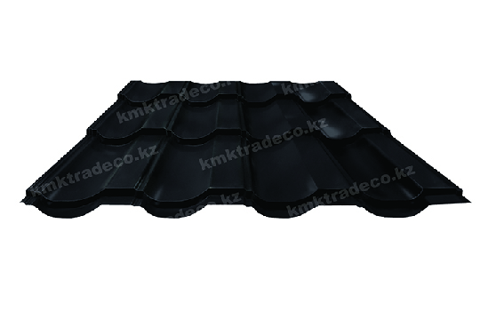 Металлическая кровля имеет максимальное сходство с натуральной черепицей. Листы изготовлены из тонколистовой стали толщиной 0.45 мм с МАТТ (матовым) покрытием премиум-класса – придаёт поверхности кровли необычный матовый «бархатистый» вид. Цвет – RAL 9005 Глубокий черный. Высота профиля – 25+/-1 мм.