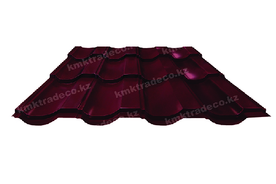 Металлическая кровля имеет максимальное сходство с натуральной черепицей. Листы изготовлены из тонколистовой стали толщиной 0.50 мм с МАТТ (матовым) покрытием премиум-класса – придаёт поверхности кровли необычный матовый «бархатистый» вид. Цвет – RAL 3005 Красное вино. Высота профиля – 25+/-1 мм.