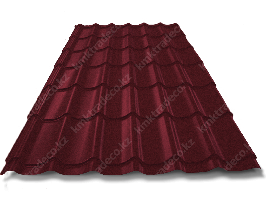 Металлическая кровля имеет максимальное сходство с натуральной черепицей. Листы изготовлены из тонколистовой стали толщиной 0.50 мм с МАТТ (матовым) покрытием премиум-класса – придаёт поверхности кровли необычный матовый «бархатистый» вид. Цвет – RAL 3005 Красное вино. Высота профиля – 25+/-1 мм.