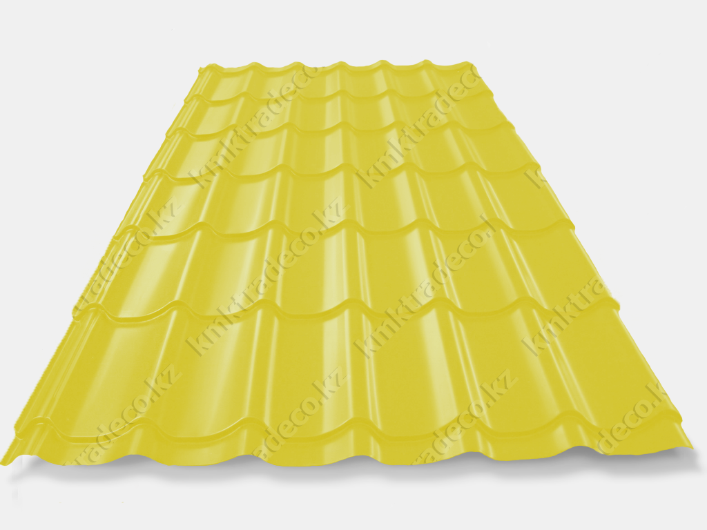 Металлочерепица Супермонтеррей – один из самых популярных видов данного кровельного материала. Металлическая кровля имеет максимальное сходство с натуральной черепицей. Листы изготовлены из тонколистовой стали толщиной 0.4 мм с полимерным защитным слоем. Цвет – RAL 1018 Цинково-жёлтый. Высота профиля – 25+/-1 мм.