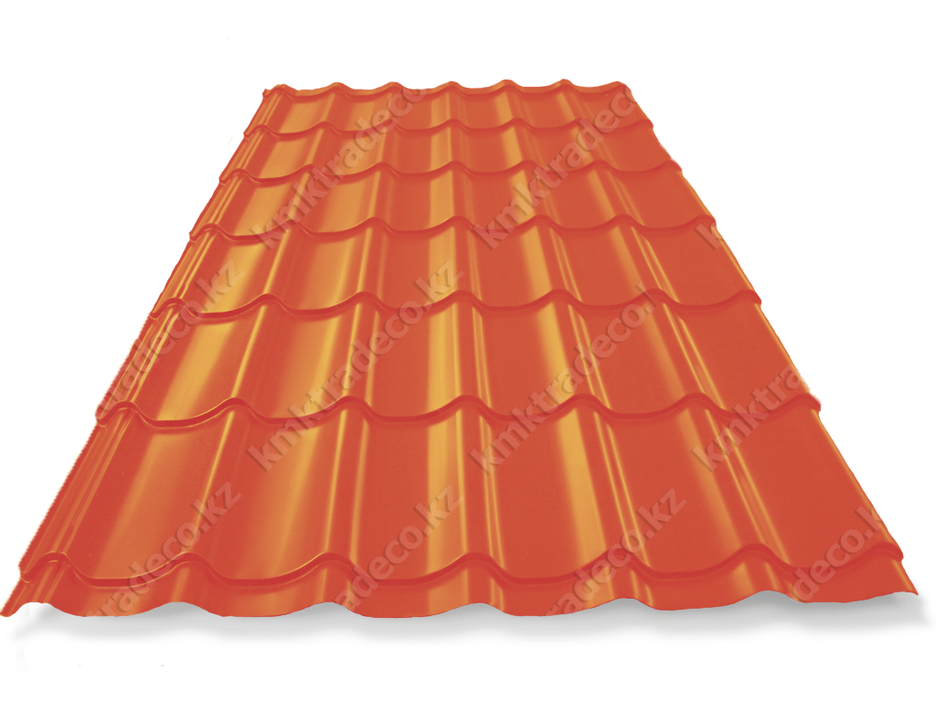Металлочерепица Супермонтеррей – один из самых популярных видов данного кровельного материала. Металлическая кровля имеет максимальное сходство с натуральной черепицей. Листы изготовлены из тонколистовой стали толщиной 0.5 мм с полимерным защитным слоем. Цвет – RAL 2004 Чистый оранжевый. Высота профиля – 25+/-1 мм.