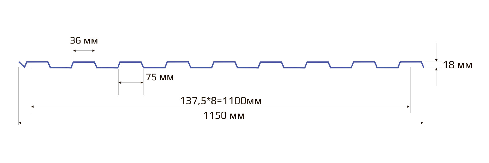 Вместе с тем, лист такого профиля имеет максимальную рабочую ширину - 1150 мм, благодаря чему упрощается монтаж и достигается минимальная стоимость квадратного метра.