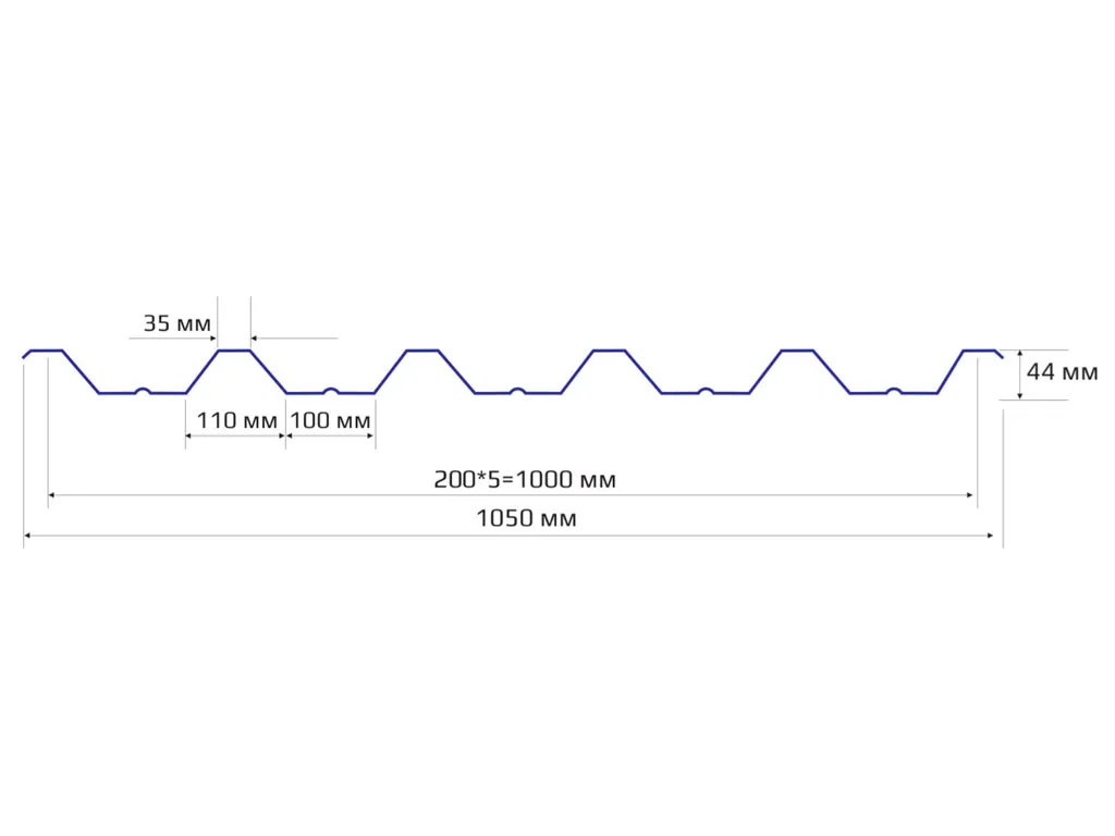 Рабочая ширина листа НС-44 ровно 1000 мм, толщина – 0,45–0,8 мм, при заказе можно выбрать длину от 0,5 до 12 метров с шагом 5 см.