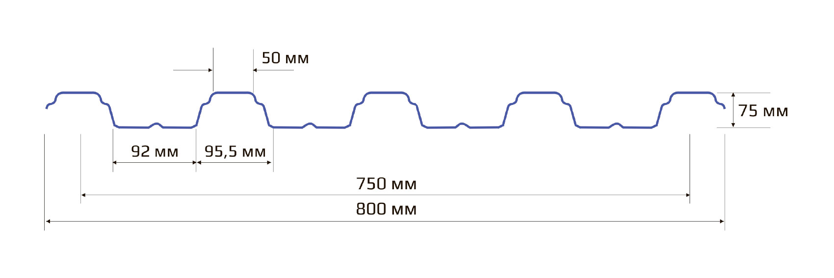 Высота профиля - 75 мм, а также дополнительные рёбра жёсткости дают возможность использовать этот материал в тех случаях, когда прочности листов с меньшей высотой трапеции уже недостаточно.
